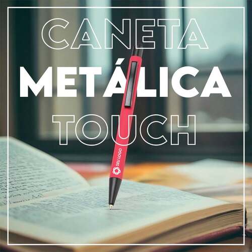 Caneta esferográfica em alumínio reciclavel com escrita em azul. Refil tipo parker e ponta touch emborrachada.*apresenta símbolo de reciclável na parte traseira da caneta.