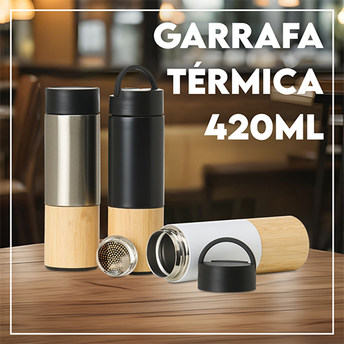 Garrafa térmica em aço inox com parede dupla com capacidade de 1L com infusor de chá. Tampa em aço inox rosqueável com anel de silicone para vedação. Possui alça de transporte em plástico. Pintura brilhosa.Conserva líquidos : ??8 horas ??12 horas